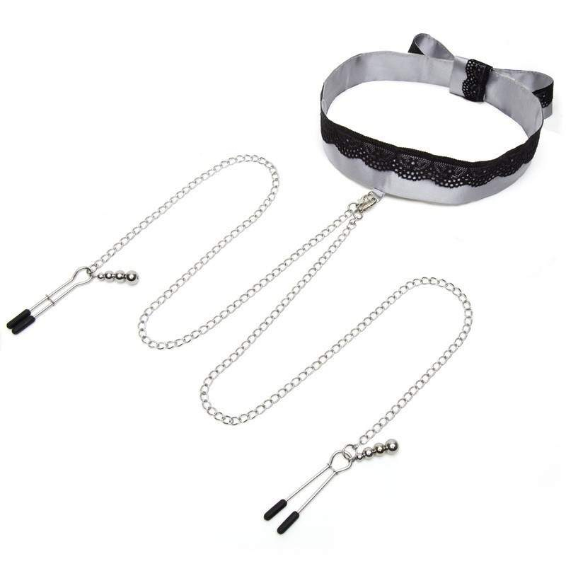 Ошейник + зажимы на соски "Fifty Shades of Grey" серый атлас с кружевом